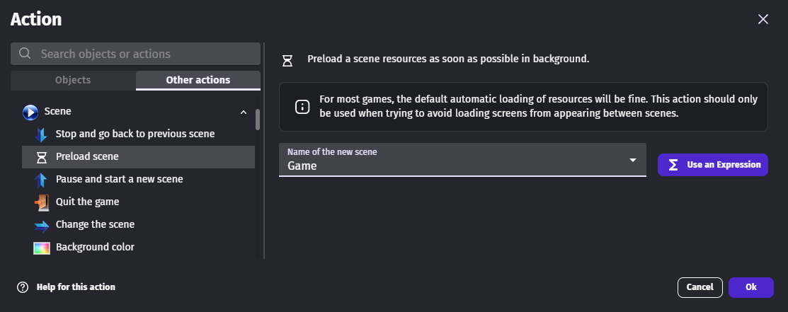An action allows to change the default loading order by choosing which scene to pre-load in the background next. For instance, this action can be used at the beginning of the scene to make sure that the next level will be pre-loaded as soon as possible.