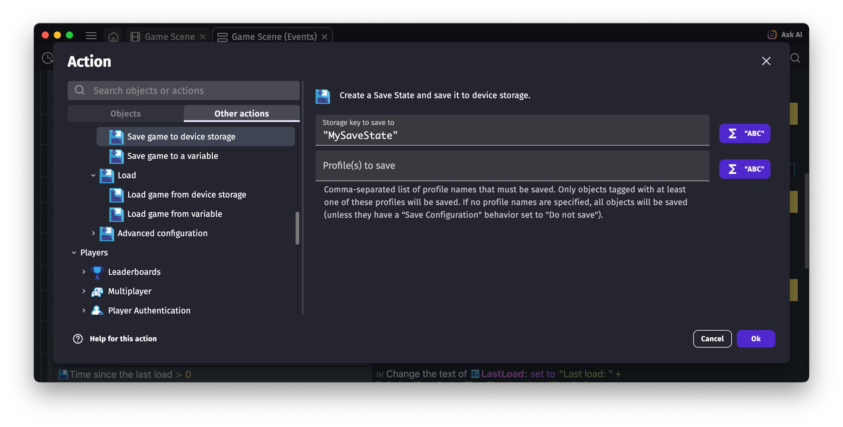 - Change the save configuration of a scene data: this does the same for the scene variables, timers, layers, asynchronous actions (Wait X seconds).