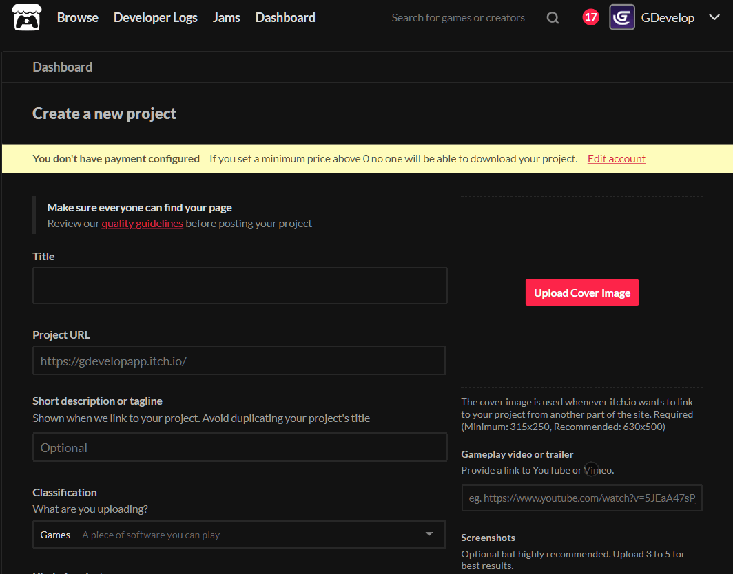 Once you have an itch.io account, you want to login and you want to go to your Dashboard. Here you should find a Create new project button